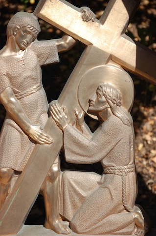 Jesus—fully man, God incarnate, tempted in all ways like us, one who experienced hunger, thirst, and weariness, just like us—after being beaten, collapses under the weight of the cross, under the weight of what his ‘yes’ to God means for him. Jesus is one of us, human, beaten down, even stumbling; and yet, he continues, spurred on by love of God, trust in God and a deep love of for you and me. The weight of the cross and that which is soon to come weakens his body and may even trouble his mind and spirit, but his resolve is unaffected. Jesus continues to the place of the skull, to Golgotha.